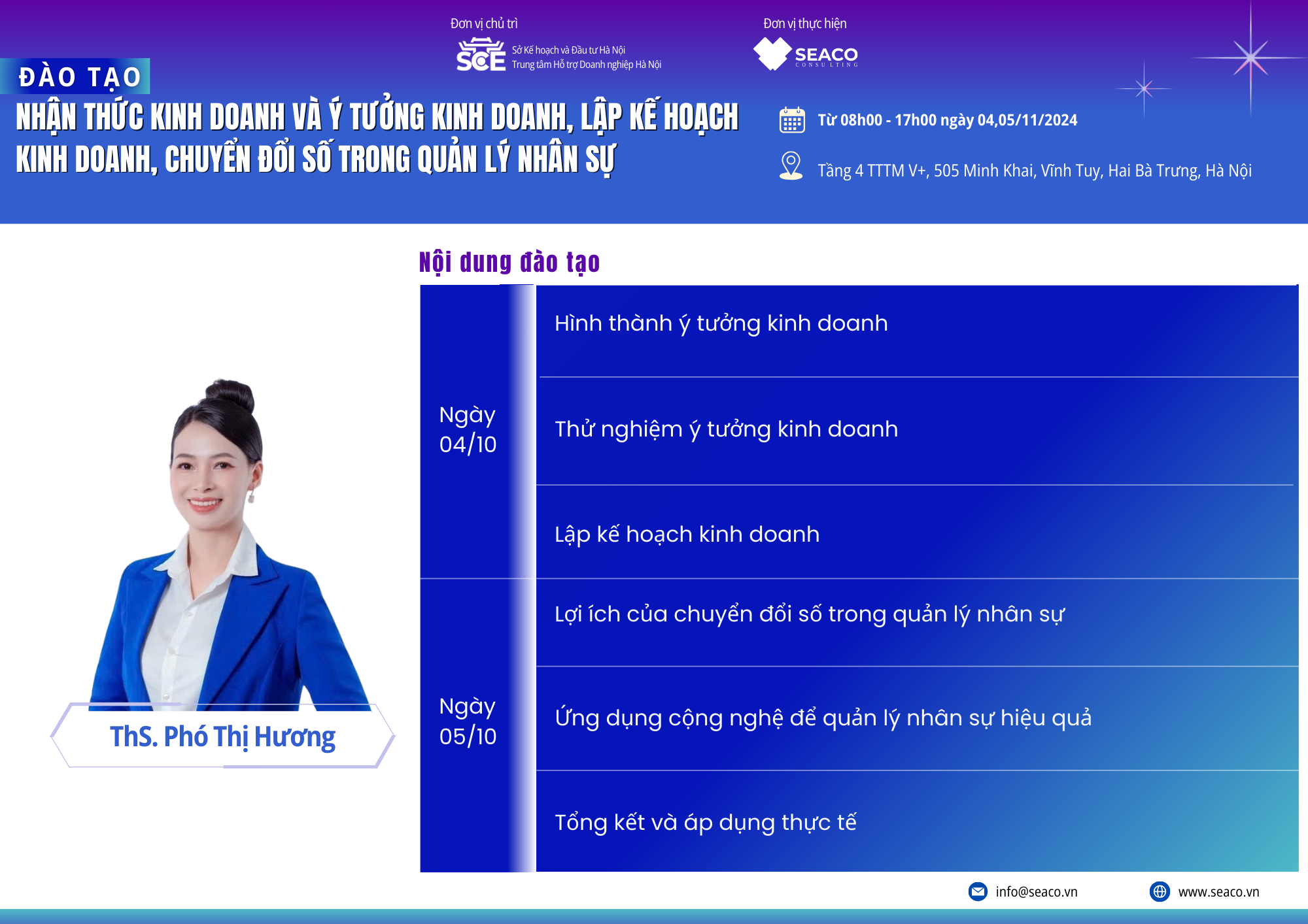 Để bắt kịp với sự chuyển động của thị trường nhất là trong Kỷ nguyên số giúp Doanh nghiệp, Công ty Cổ phần Seaconsult xây dựng và triển khai chương trình đào tạo: Nhận thức kinh doanh và ý tưởng kinh doanh, lập kế hoạch kinh doanh và Chuyển đổi số trong quản lý nhân sự”. Chương trình được triển khai với đội ngũ giảng viên được đào tạo theo chuẩn quốc tế, có kiến thức và kinh nghiệm thực tế trong quản trị DNNVV.